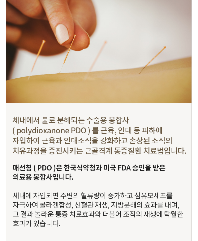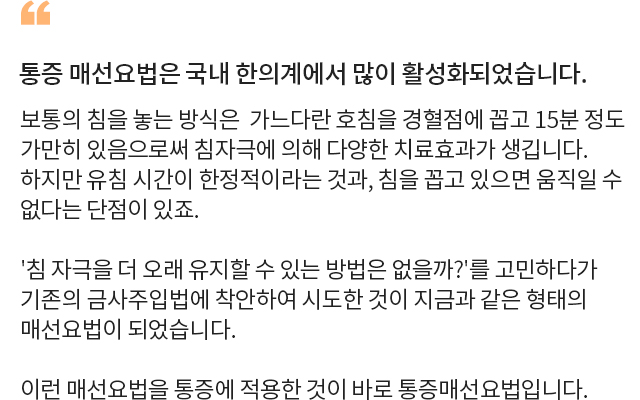 특수 고안된 기구를 이용하여 한방약액과몸에 흡수되는 특수사를 통증부위에 삽입