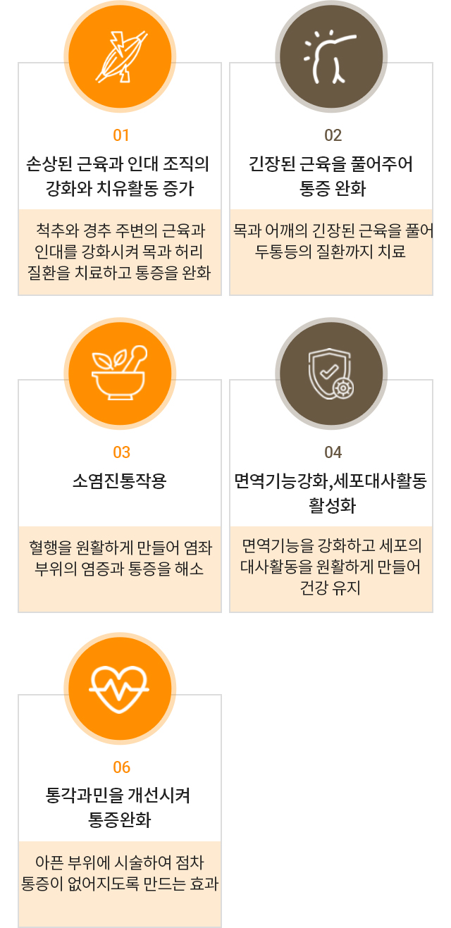 인체의 경락, 경혈에 자입하여 효과적인 치료를 이끌어내는 치료법 기혈순환을 촉진시켜 경락순환이 전되면서 제반증상을 없애주는 효과